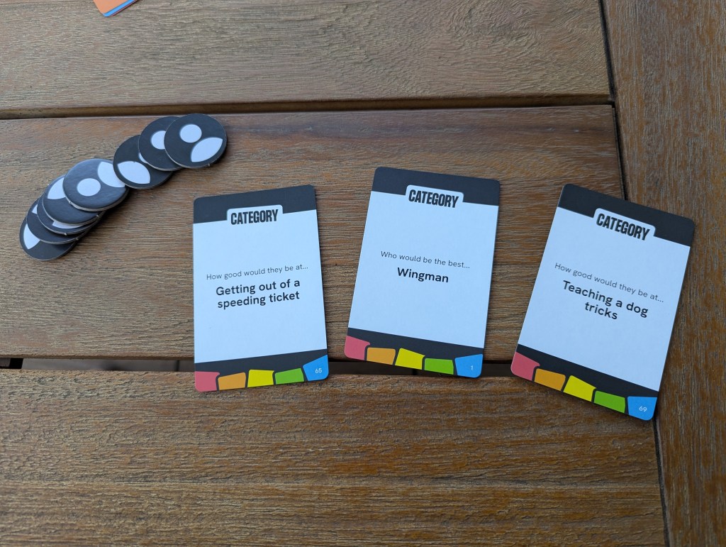 Coming up with your own category is still the best chance the game has to be great. My playgroups really did not find much of anything amazing in the game’s provided deck, even while scouring through it. Crafting a category that is something you want to talk about anyway, with characters chosen by your friends who are giving you things they want to talk about with you– all of this can combine into a fun and hilarious round, whether you score well or not.