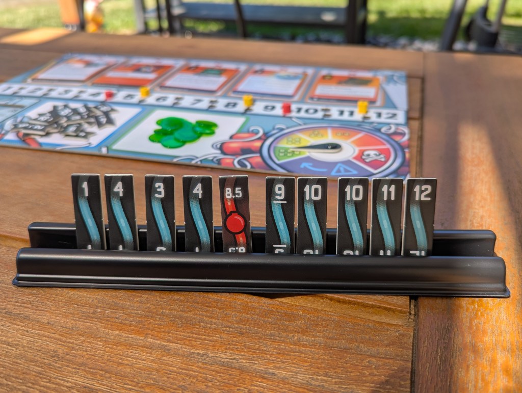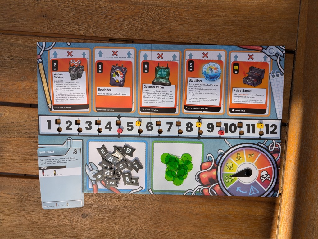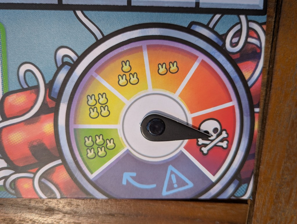 So, in response to those scenarios, Bomb Busters is a game about playing it safe. If you know where the red might be, just cut where it can’t possibly be, right? But when your turn comes around, you have to cut something. “Surely,” I think, “there’s something safe to be done somewhere. The three other players glaring through my forehead seem to think there is something obvious to do.” Sometimes, it suffices to take the safest plunge in an ocean of unknowns. Sometimes, though, you are caught up in the swirl of a vibe check and now it’s time to touch the middle-est wire on the most unknowable rack to crack the case wide open with pure intuition– or blow everybody up.
