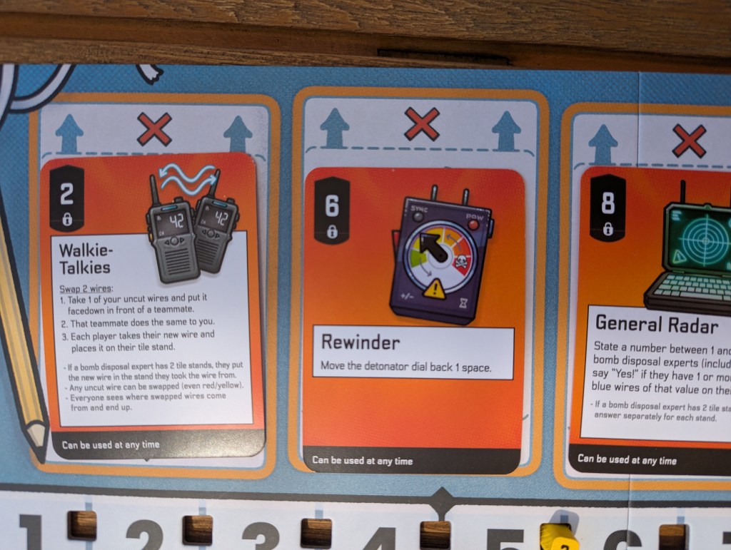 Bomb Busters packs a lot of enjoyment into this simple gameplay loop. The evergreen additions are the aforementioned yellow and red wires, as well as gadgets. Gadgets are one time opportunities to cheat, getting information or skipping a turn such that pure deduction isn’t the only way out. Even the weakest gadget will deploy like a lifesaver when you are otherwise lost.