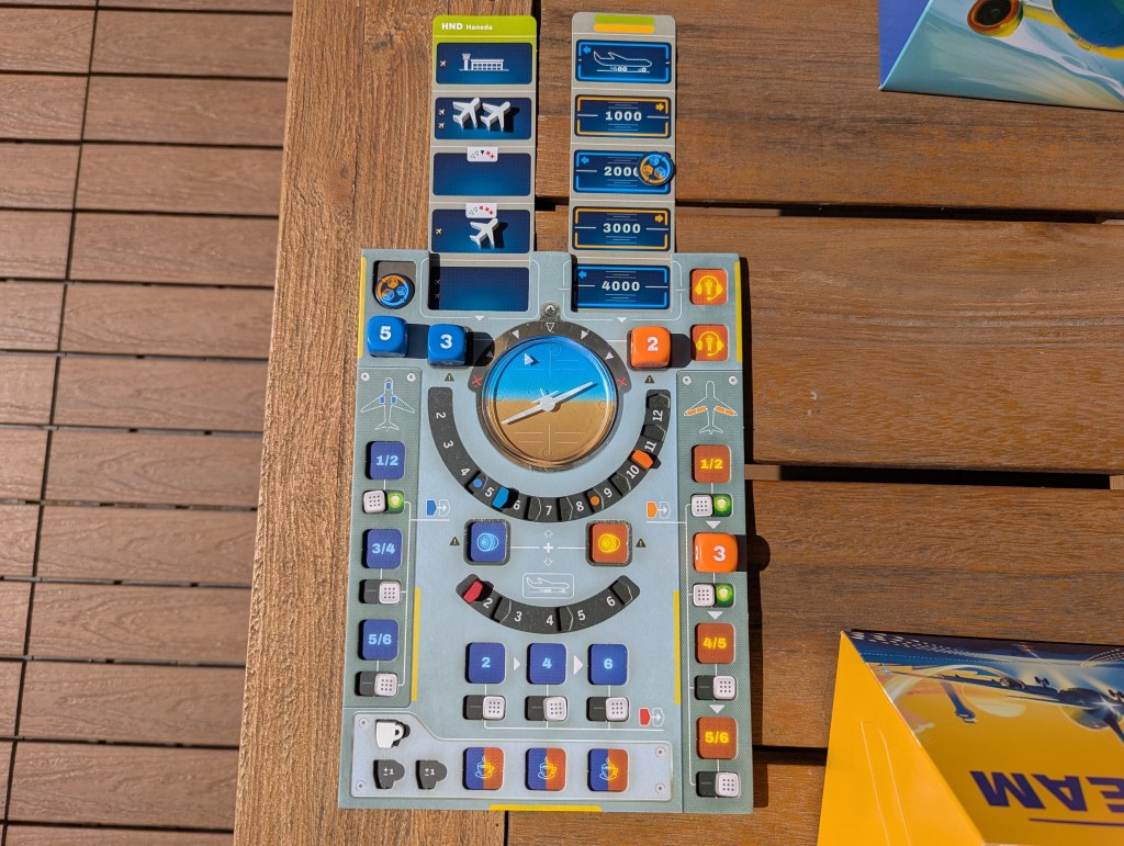 The components, especially the chunky dice and the little plasticky airplane axis marker, are all great, too. The spots where you will be deploying your dice are inset, so nothing is going to slide out and get confusing, which is nice in a game where players can’t communicate. There are neat little plastic dials are both very practical and incredibly satisfying to slide into place. The player aides double as havens to hide your dice from your partner, and the console between you two is perfectly legible and easy to parse at all times.