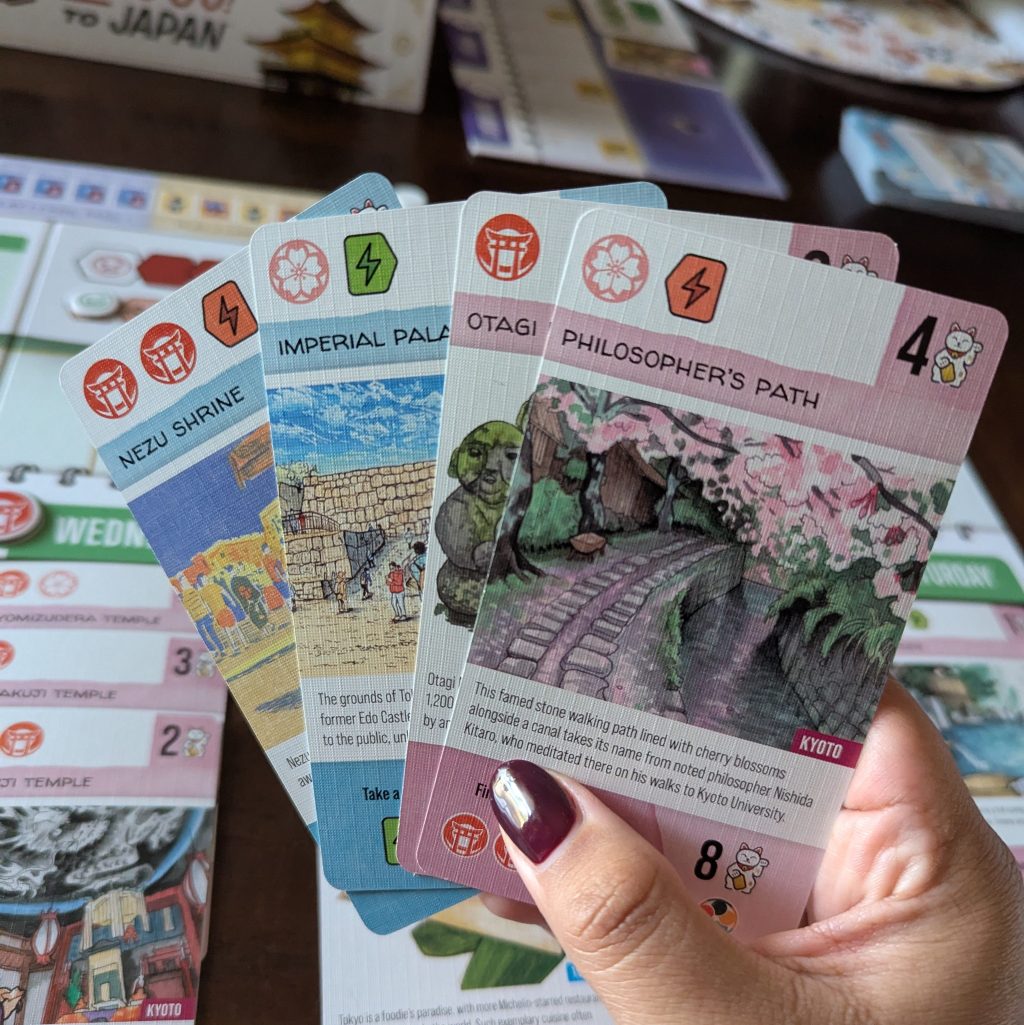 I would go so far as to say the game feels generous. If the offerings you drew (or were passed to you) simply don’t fit into your plans, you can always take a walk instead. As an avid pedestrian, this is probably my favorite mechanic. Taking a walk is worth some points by itself– as it should. I would feel robbed if I couldn’t go on a little aimless walk on my trip to Japan. However, at the end of the game, as you go through and score each individual day, you may peak at the flip sides of your walks. Your aimless walk around Kyoto could turn into an impromptu visit to a ramen shop you otherwise wouldn’t have seen, or a small shrine, or any other activity in the game.