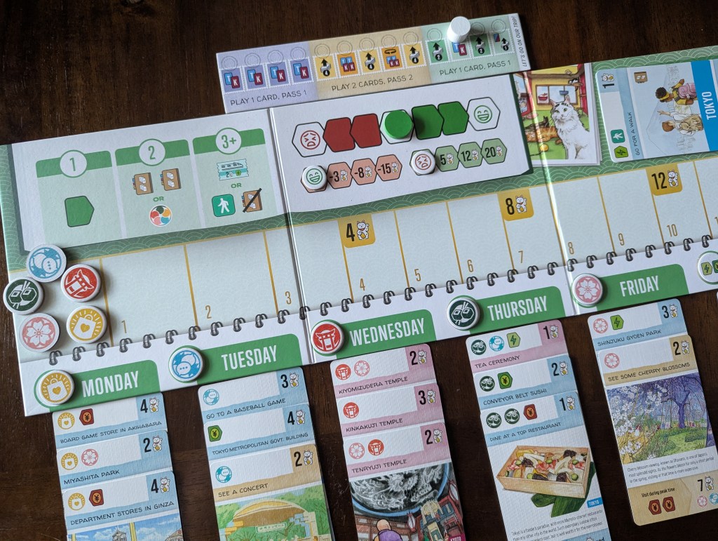 I enjoy the flow of this game, too. In the beginning, you are non-committal about what you’ll do. At most, you’re committing to what cities you might be in for a day or two. In the mid-game, you are now placing two cards per turn and the week really starts to shape up with bonus objectives. You have an idea of where you’ll be and what you’ll be doing on most days. The last few rounds go back to one card per turn, which makes sense as you are often plugging holes or rounding out a day. Then, you score.