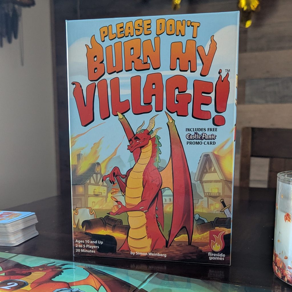 Oddly enough, I am reviewing a second game in the month of October whose name contains an exclamation point. I was, to this point, aware of less than five games whose names were even worthy of being shouted. The name is not the weirdest part. Somehow more surprising, Please Don’t Burn My Village! has a smoldering dragon on its cover– suggestively raising an eyebrow at any would-be players and expectantly awaiting its bribe. Strange stuff going on here.