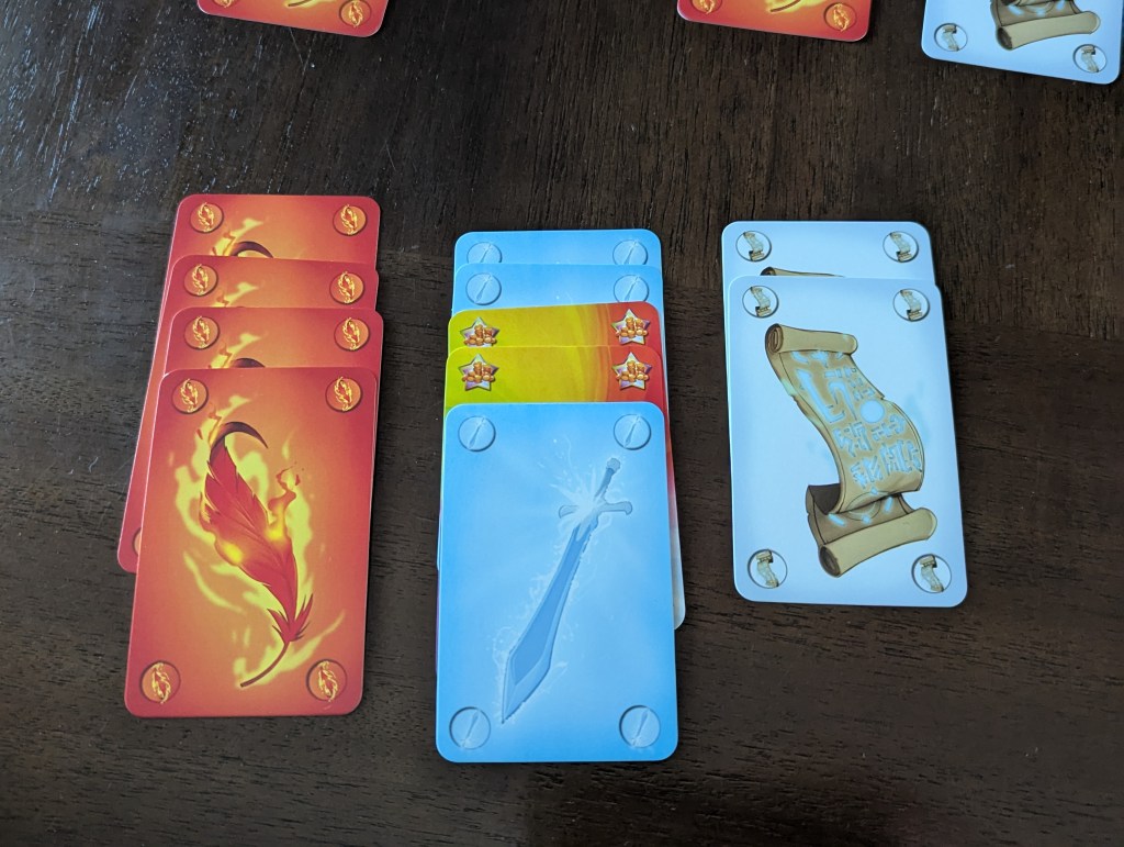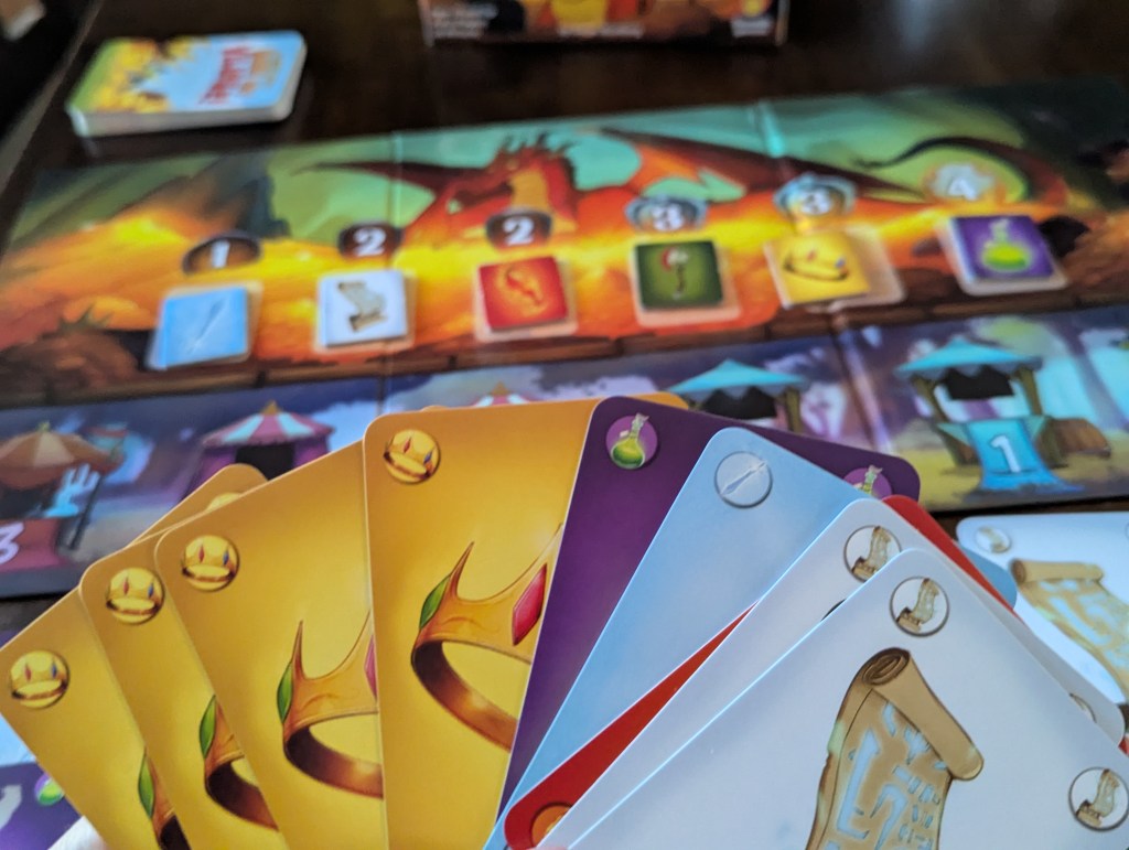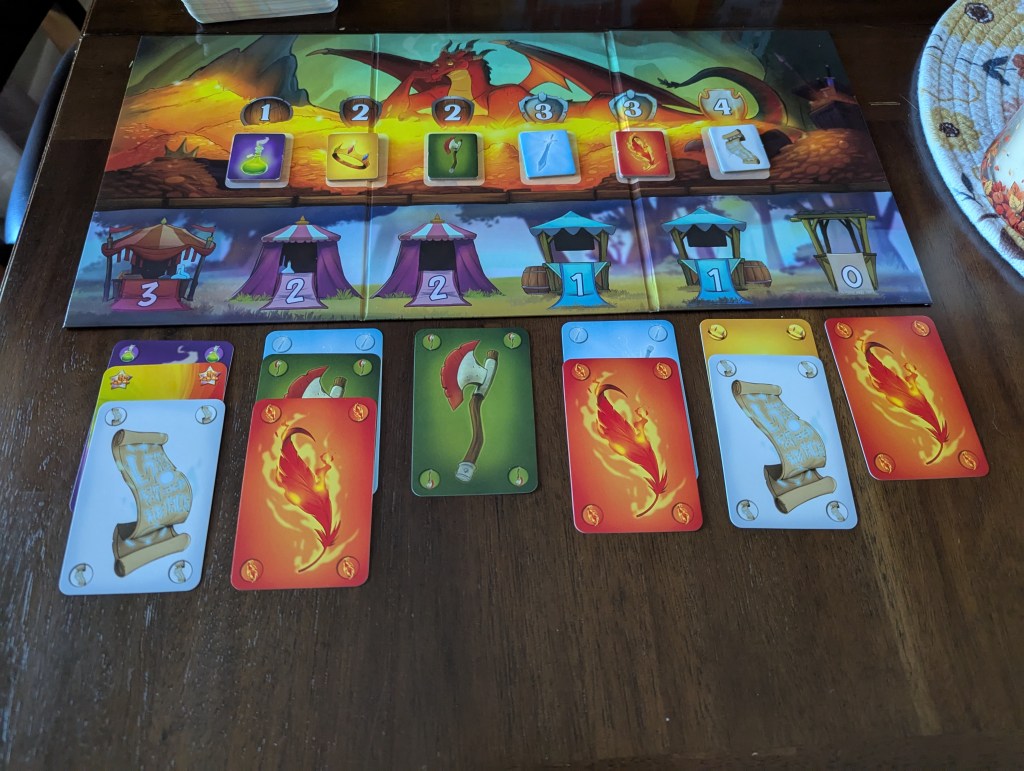 The game ends when the draw pile runs out, but how many cards get pulled from the draw pile each turn is something you’ll be wagering on in the waning moments. Whenever a bribe is placed, cards spill from the draw pile into the market. The first card goes into the 3-discard shop, then the 2-discard shop, and so on. This will continue, looping even, until a Wild or the bribed card shows up. If there’s 9 cards left and someone bribes the dragon with a couple of those holy-looking scrolls, we might be right onto scoring then and there.