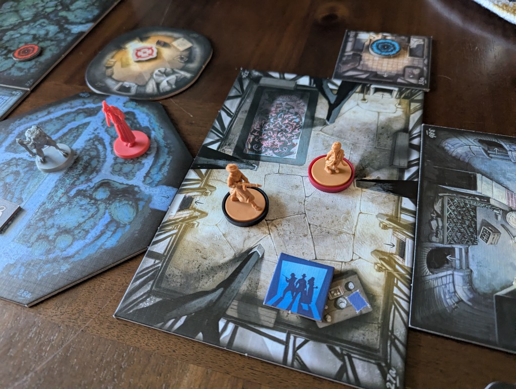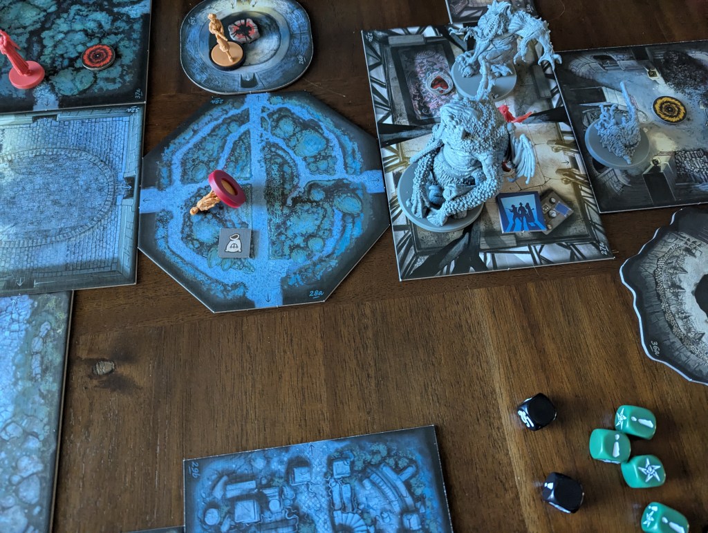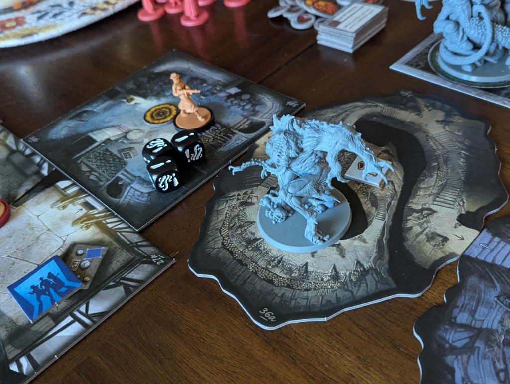 Instead of a collection of tiles and miniatures, I feel there is something bigger and more cinematic happening. The one-ish paragraph on a discovery card often tells me more about the episode than all the sculpted detail on the episode’s gruesome little baddies. I can imagine a more modular discovery system, with more randomness and variability, but that version of Fear of the Unknown is much worse.