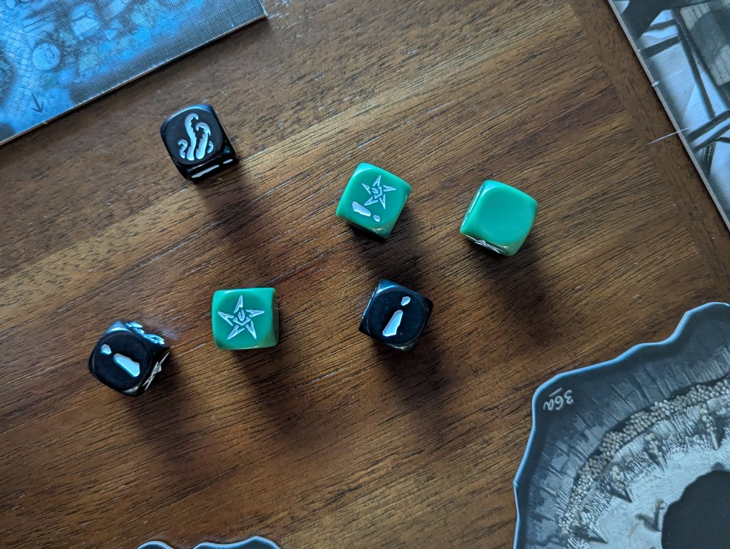 This system creates enough drama to keep each of the six episodes in Fear of the Unknown tense and surprising. I also enjoy the spectrum of success present in this game. For a brief moment before going insane, you’ll get to rolling 5, 6, 7 dice at a time and steamrolling just about everything you attempt. But at the beginning of the game, you only have 3 dice. All of those starter dice have the “lose some sanity” symbol on them. There will be tradeoffs.
