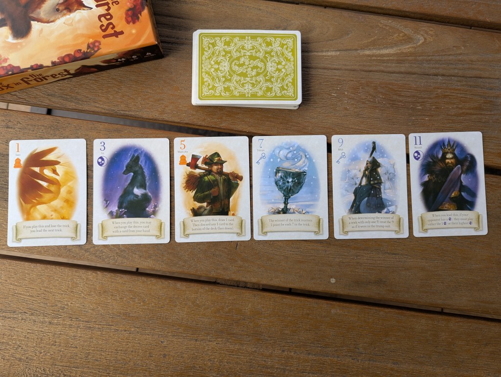 I also appreciate that there are only 3 suits. Again, it seems like something that would at most be a subtle change. However, my ability to count cards and remember what has been played is fairly awful in 52-card deck games. Here, with 3 suits and 11 cards each, it is suddenly manageable. There are also only 6 “unknown” cards each hand, so I can predict at least some of the cards my opponent must have been dealt based on what I don’t have. Even if you aren’t someone who counts the cards or sets little fox-traps, there is still room for you in the forest. If your plans collapse, maybe you got to 4 wins on accident, all is not lost. Scrapping for an extra trick or two to get up to 5 or 6 is worth a couple points, too. As this was my entry point into the genre, I appreciate that little consolation prize. Without it, I would be getting blown out by my partner even more.