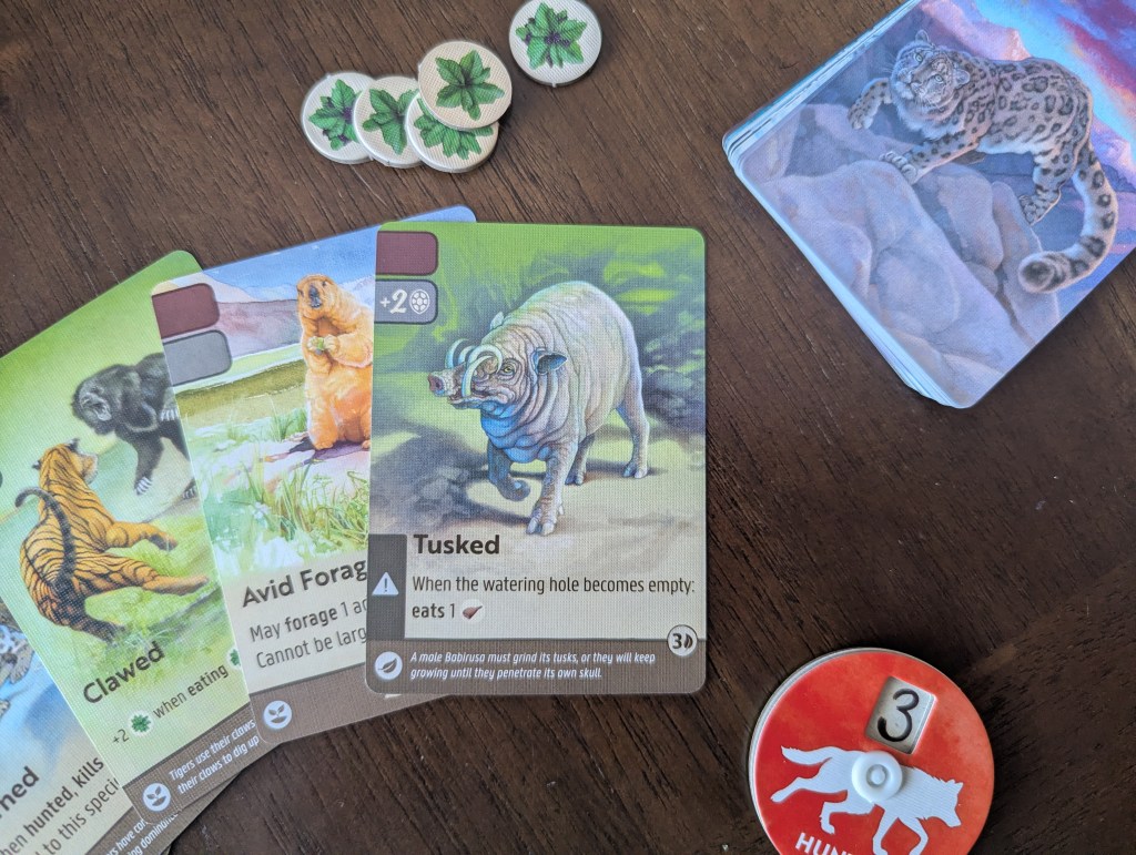 There is a relatively small set of traits, but each of them are unique and worthwhile in the right competitive environment. A Tusked animal gains the ability to eat some meat (an omnivore!) whenever the watering hole becomes empty–perfect if other animals are being greedy. A Clawed animal is just that, greedy, able to grab more food and feed more of their population at once. The most warping of these traits (and they’re all very distinct) is the ability to forego foliage altogether and convert your species into a hunter.