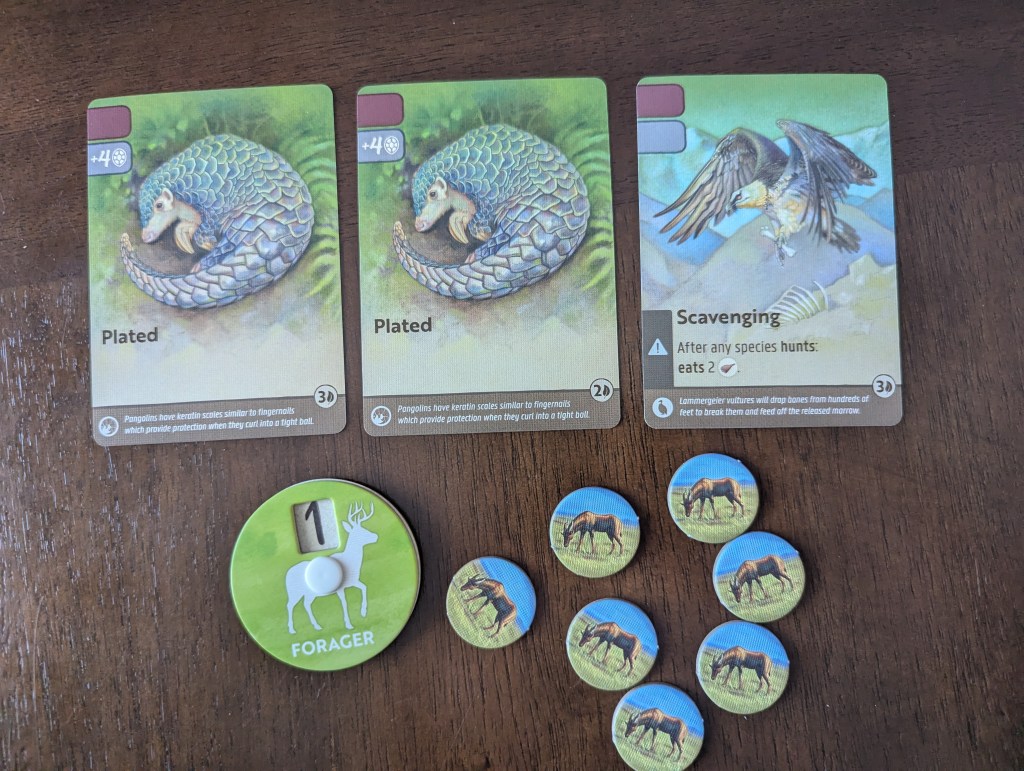 Whenever one of your animal population tokens die, whether from starvation or being turned into food, that population is rolled into the species you are given next round. Whenever a species of yours is wiped out, gone from the treadmill of evolutionary history, its body size is also rolled into that next species. Even the traits you invested into it are fully refunded back into your hand. If someone invents a tiger to kill your elephant, your next species will come back as an elephant-shaped blank slate. On a meta level, you lost some points. But textually, the circle of life continues. More animals show up at the watering hole the next day, evolved to handle what your last creation could not.