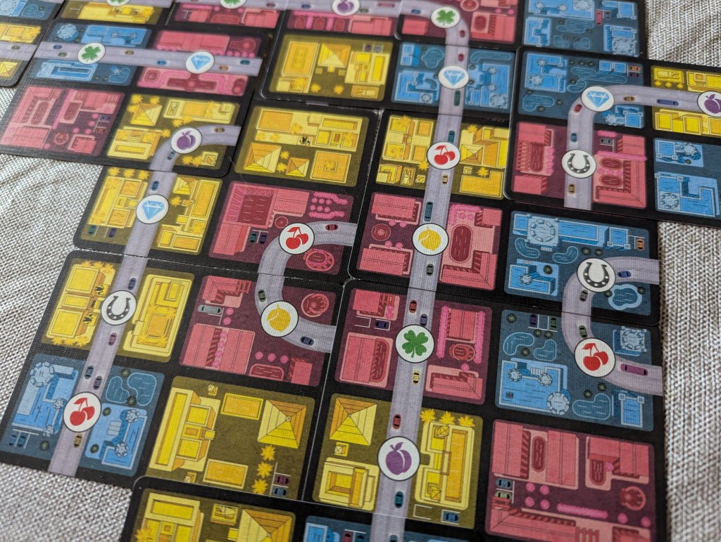 The main thrust of Casinopolis is the simple but robust scoring. You score points for having “jackpots” which are roads with runs of the same symbol. You lose one point per distinct road you create, so you are incentivized to have a few long roads. Further, you also score for the biggest districts of each color but only if those districts touch your longest road, called your strip. That already may seem like enough to chew on. There’s more.