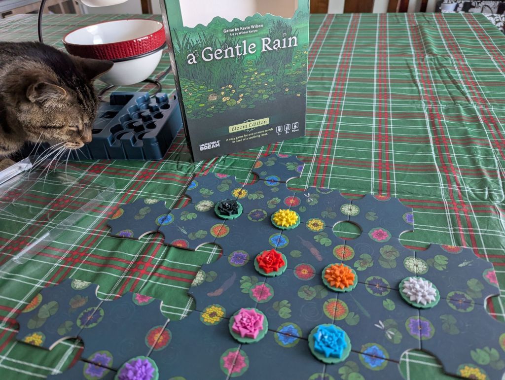 As I’ve played the game more, I have definitely gotten better at it. Knowing what shapes and patterns I should lean on and what pitfalls I should avoid. Considering which color blossoms to place depending on what openings I have elsewhere. My partner, who cannot play a single player game without trying to maximize it, enjoyed the game, too. For them, there is just enough strategy to keep things interesting. I (and you) will improve rapidly if interested in doing so, which is another layer of satisfaction A Gentle Rain provides. I don’t need to memorize tiles just as I don’t need to memorize the shape of puzzle pieces, rather I become more familiar with the pattern.