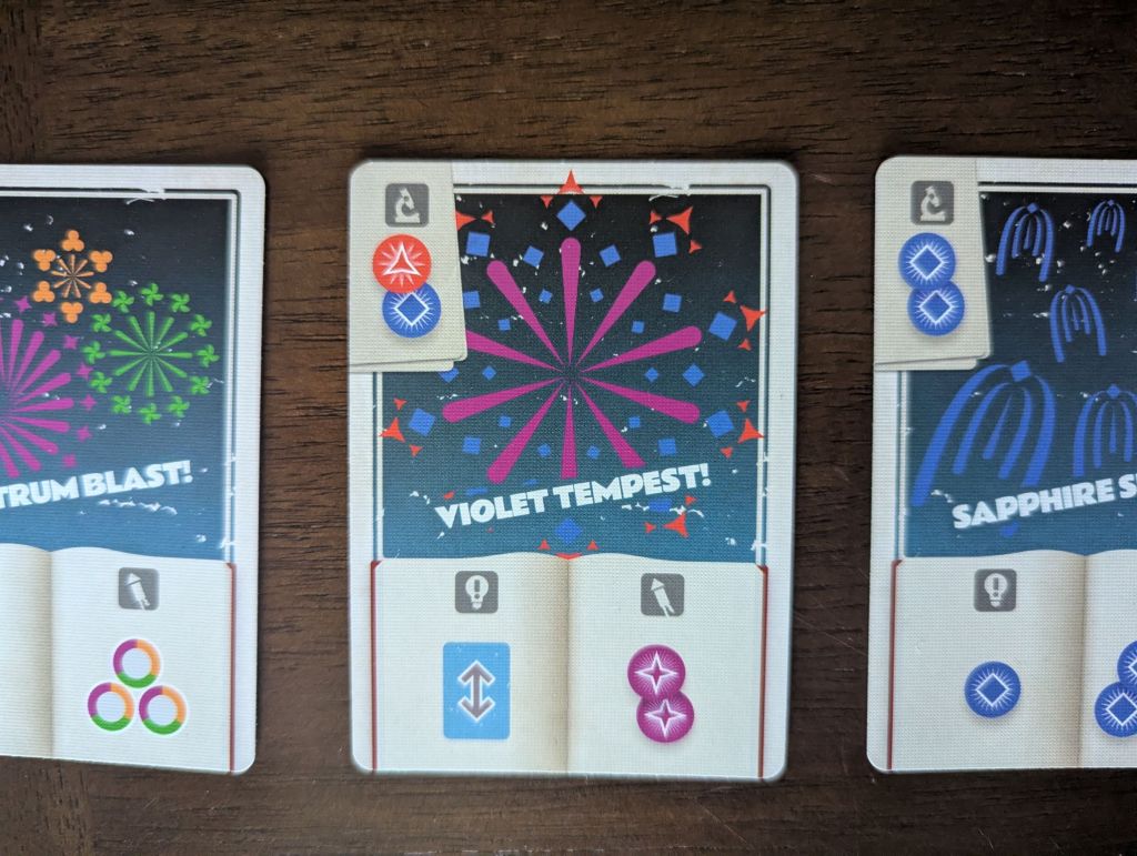 On a player’s turn, they will be playing one of their five cards into a central market, gaining or trading one of a few different sparks. Then, a choice. Either pick up a card from the display, doing some more gaining and trading. Or– and this is how to win– cashing in sparks to showcase the pictured firework, removing that card from the game and permanently lowering their hand size. When a player has no cards left, they can dust off their overalls (what do fireworks technicians wear?) and walk away victorious.