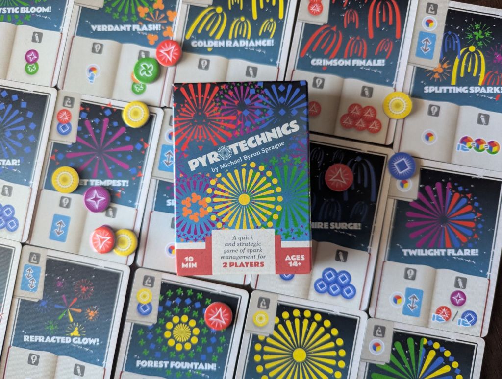 2025 was the year I got into small box micro-games. I’ve been introduced to everything from party games to solo games crammed into tuckboxes, tins, and wallets. For every limitation imposed by size, there is someone out there creative enough to accept the challenge and bound over them. Pyrotechnics by Michael Sprague does exactly that, albeit with more subtlety than explosions.