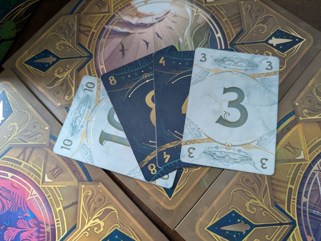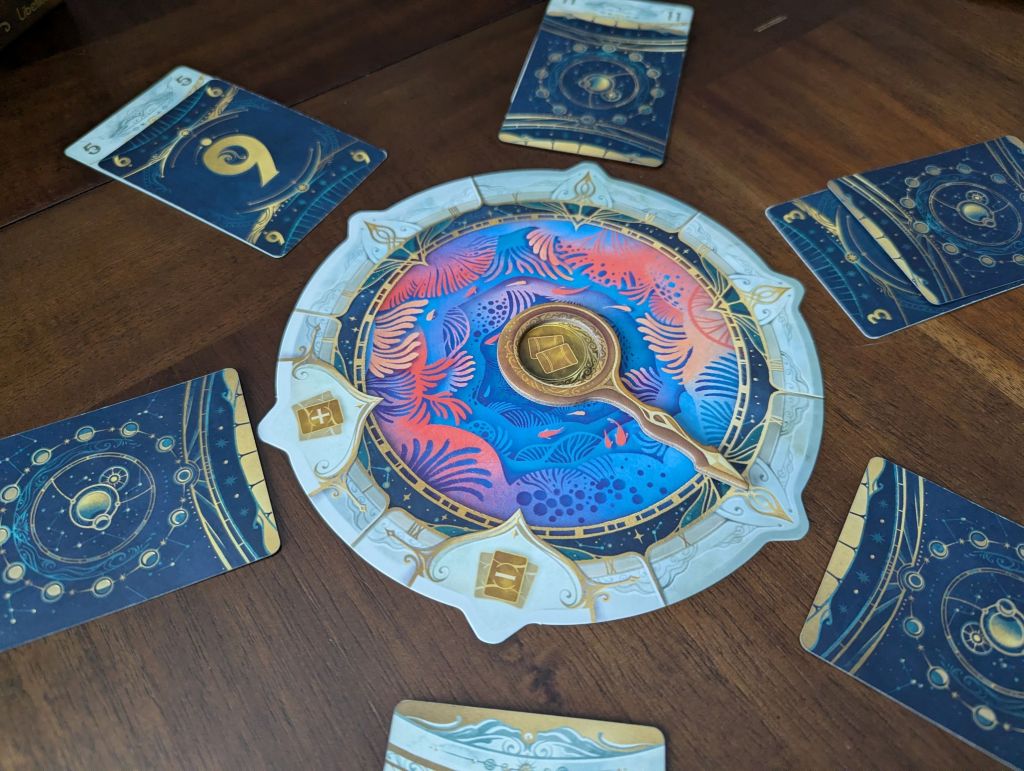 The rules are straightforward. There is a clock with six segments. There is a deck with twelve lunar and twelve solar cards each going from 1-12. Your team will be dealt twelve of these cards at random. Cards are played face-down into segments such that each segment in clockwise order sums to a number larger than the previous segment.