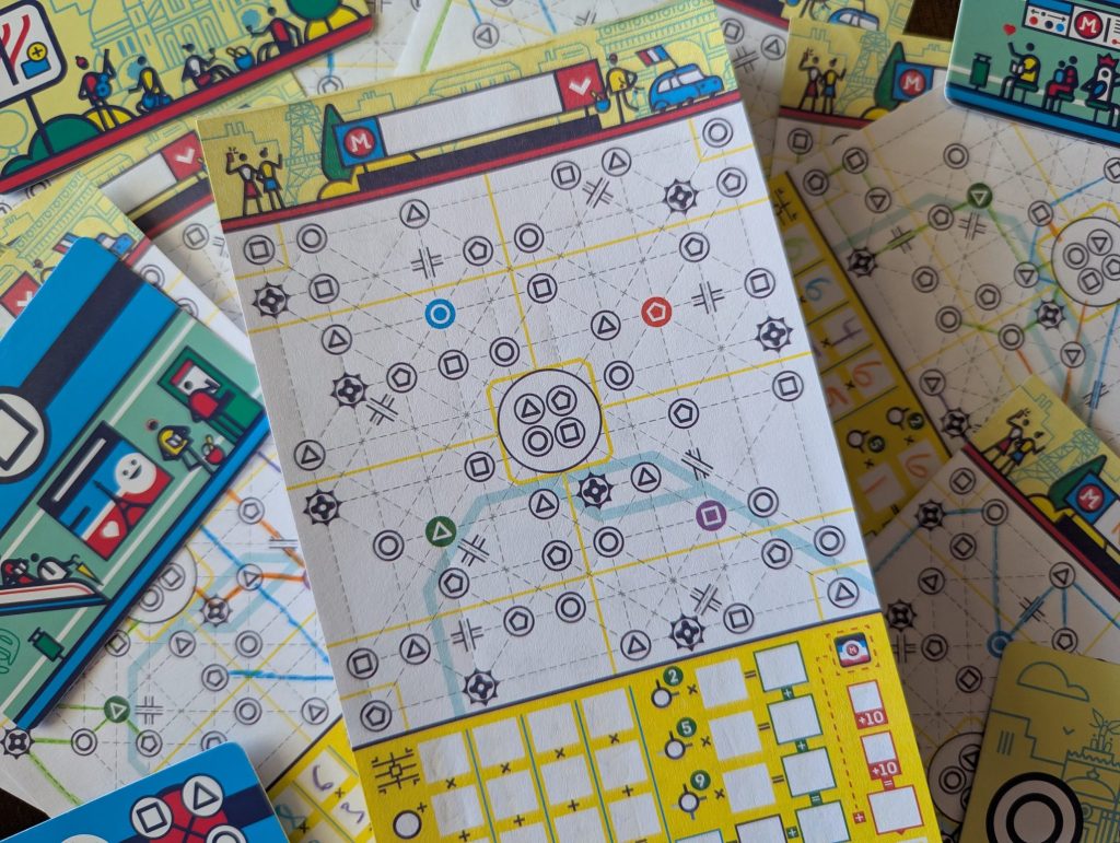 Win or lose, you are left with a pad of paper with your own vision of Paris. Blemishes and all. You’ve severely underserved an area or created at least one line whose purpose is inscrutable at best. The worst of your lines fell short due to poor planning or the cards coming out in the wrong order, but they were scrappy and aspirational all the same. Your best lines, though, you can imagine a million people riding those, heading to and from their board game cafes and burger joints and office jobs and tourist spots. If you’re anything like me, a subgame of discussion and comparison emerges when it’s all over. What real metro does my system resemble? How would a sad lil’ guy who lives at this station get downtown? Wait– which of these is the Louvre?